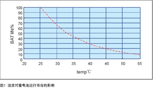 失水的途徑比較多:節(jié)流閥設(shè)計不合理,頻繁開啟;電源對蓄電池頻繁均充;環(huán)境溫度過高。其中高溫是最主要的因素,高溫會加速蓄電池失水速度,導(dǎo)致蓄電池容量下降。以25℃為基準(zhǔn),當(dāng)蓄電池運行環(huán)境上升10℃,壽命減少50%,如圖1所示。