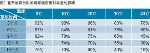 蓄電池在存放過程中存在自放電,如果長時間得不到補(bǔ)充,就會出現(xiàn)硫酸鹽化現(xiàn)象。這種現(xiàn)象如果沒有得到及時改善,蓄電池容量會降低甚至損壞不能使用。蓄電池在存貯過程中,環(huán)境溫度對容量影響也非常大,如表2所示。